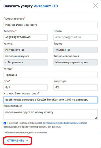 в поле «Кто Вам нас посоветовал?» указывай свой номер договора в СерДи ТелеКом